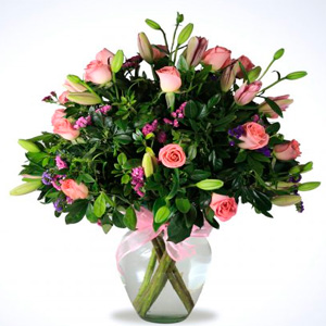Florero de Vidrio con Lilis y Rosas, ideal para aniversario o cumpleaños. ¡Regala este hermoso florero el día de hoy!